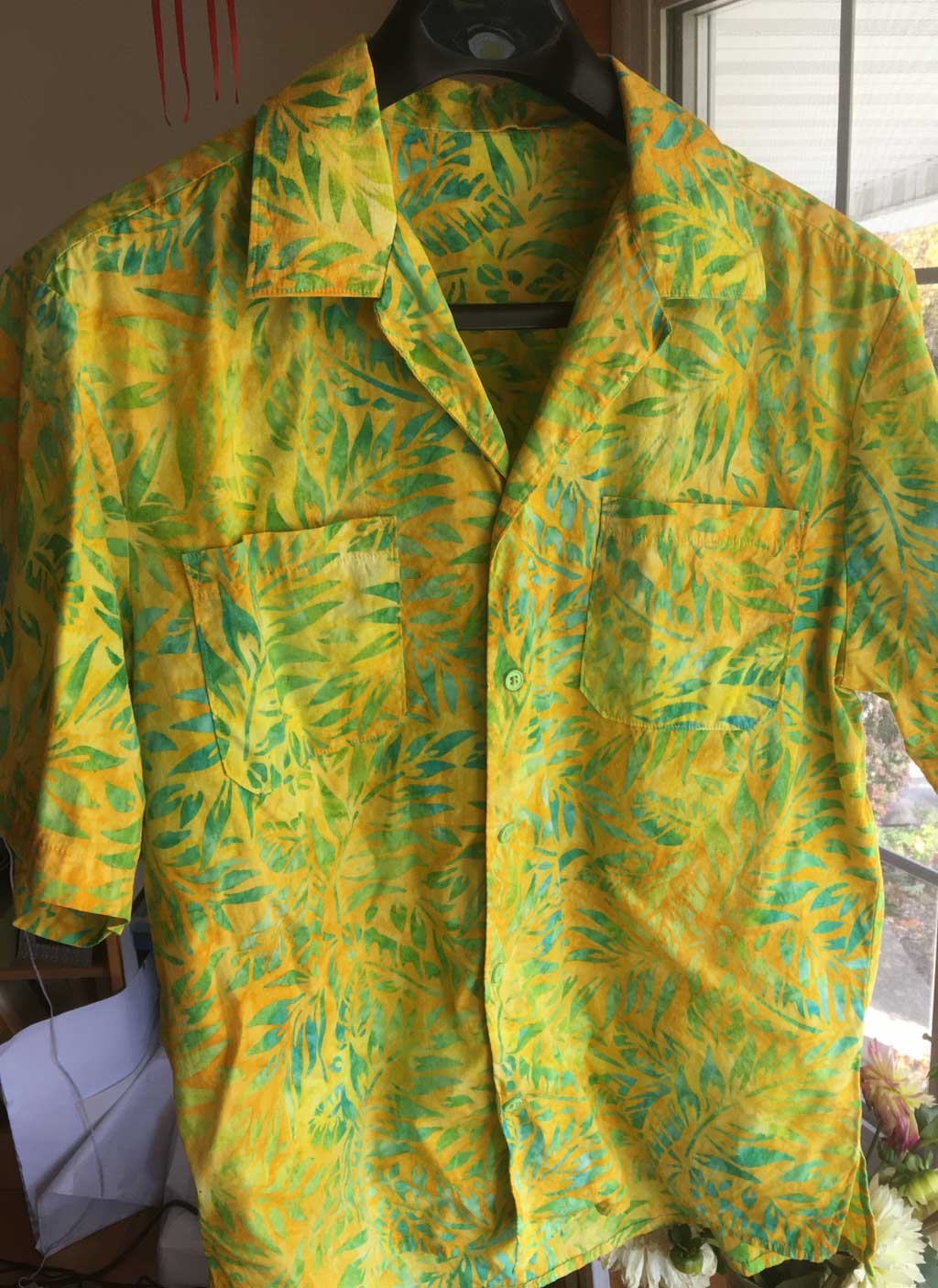 Short-sleeve Hawaiian-style shirt in a lime foliage cotton batik. Now in the collections of Peter Loffredo and Dave Loffredo.